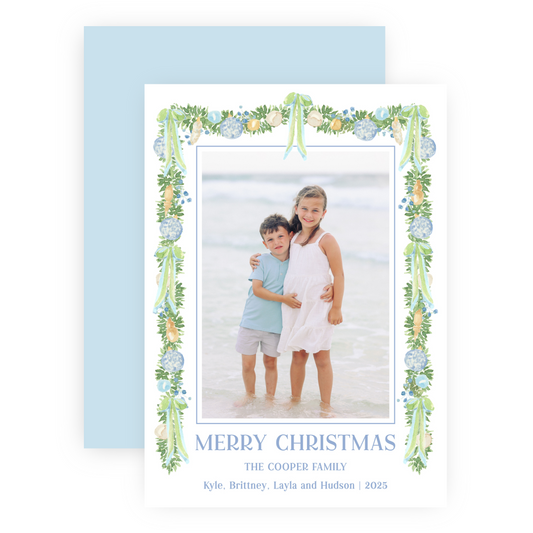 Christmas Photo Card - Big Bow Garland, Blue (Portrait)