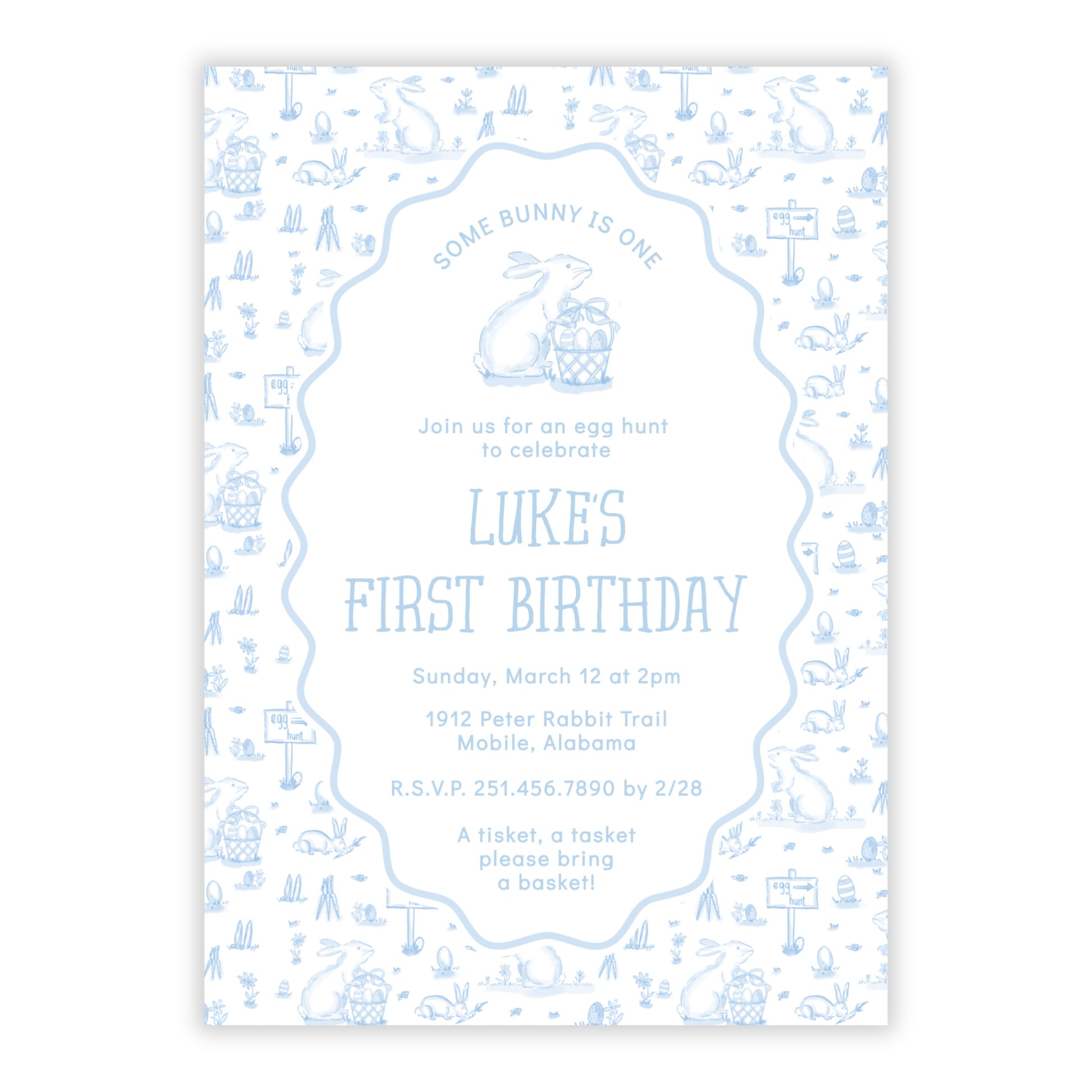 Easter Toile Boy First Birthday Invitations, Blue